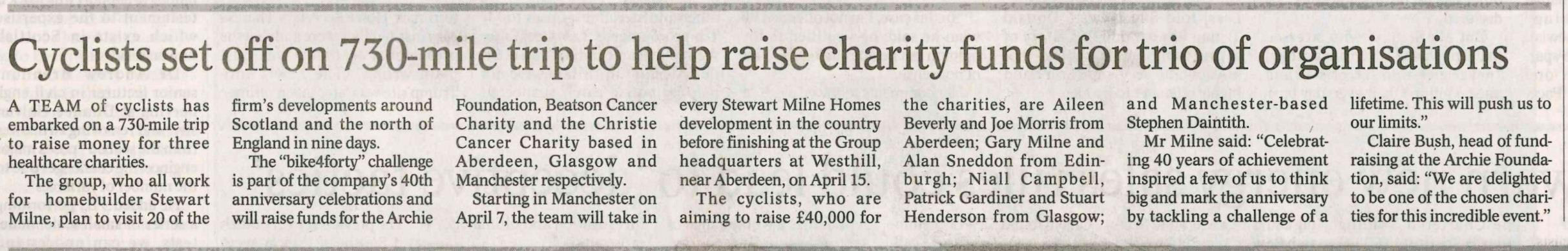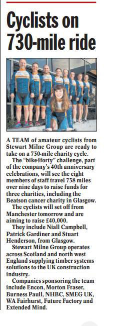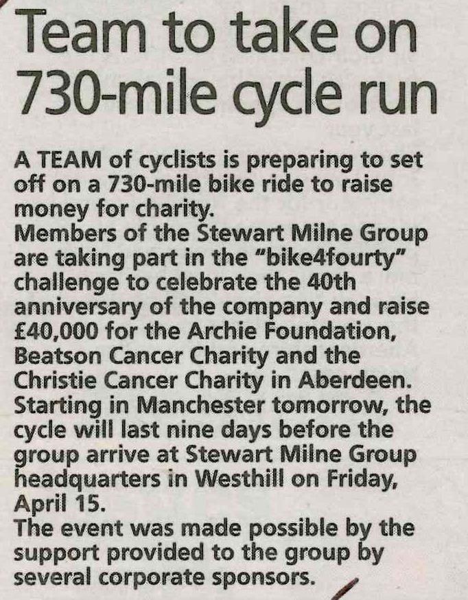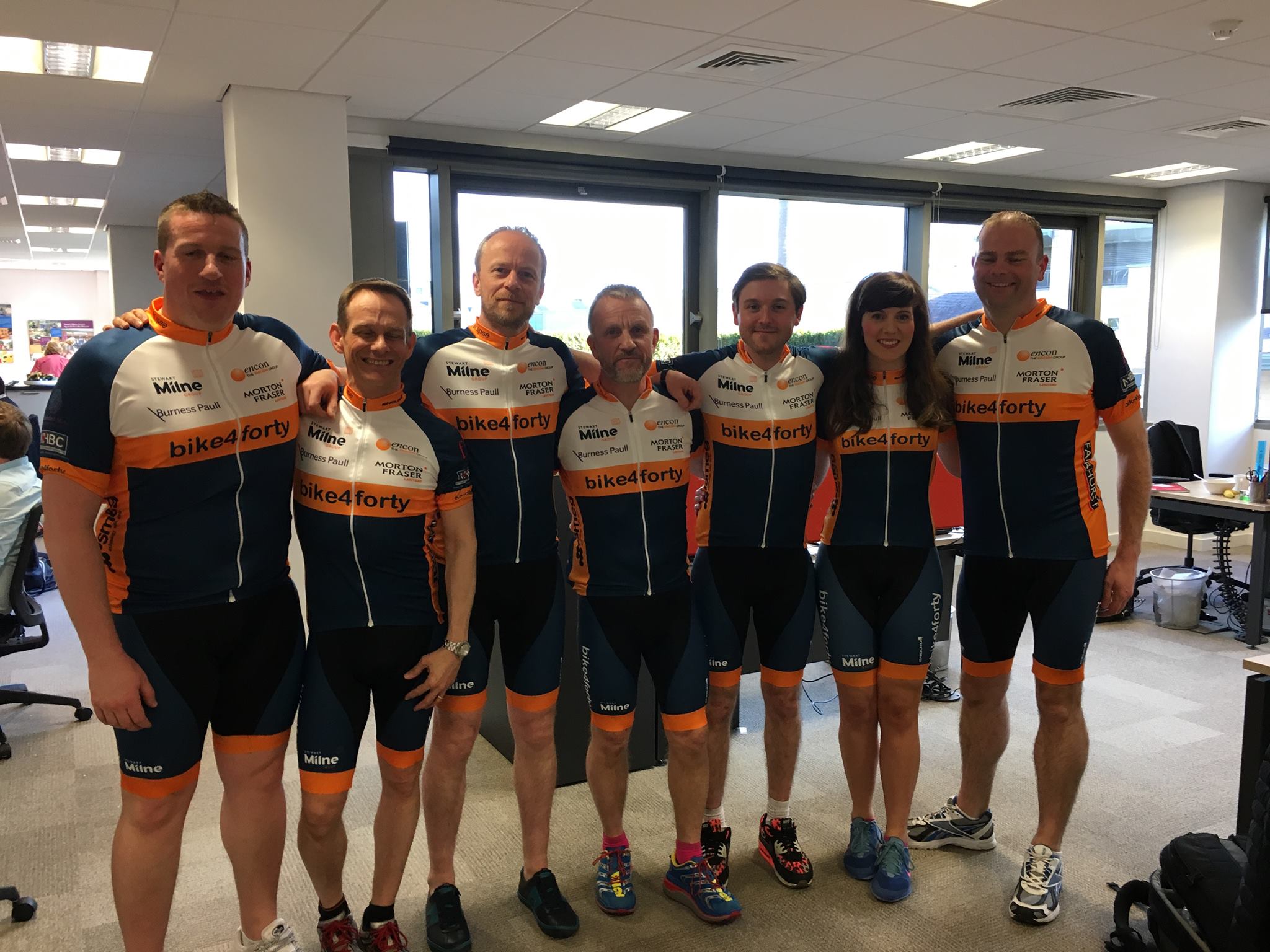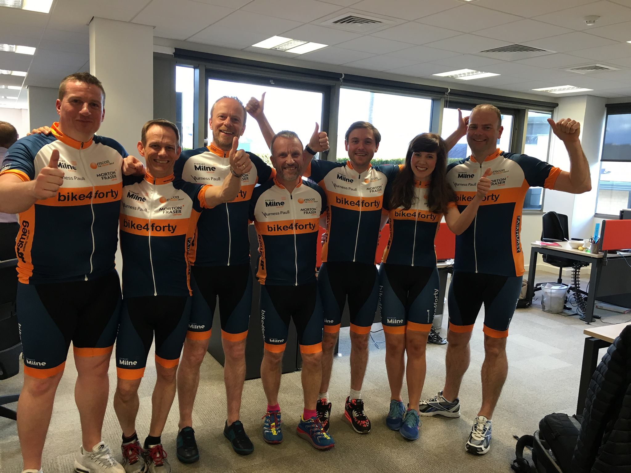 Derek Peacock, founder of future factory and Edinburgh Consultants Group will join forces with Stewart Milne Group on 9th April in Ayrshire to take part in ‘Bike 4 Forty’. ‘Bike 4 Forty’ is a gruelling road bike ride, spanning over 738 miles and climbing the equivalent elevation of Mt. Everest, or the height of a 50 storey building every hour of our ride… Yikes!! Their mission? To raise as much money as possible for three fantastic charities; The Archie Foundation of Aberdeen, The Beatson Cancer Charity located in Glasgow and last but certainly not least The Christie Cancer Charity which is based in Manchester. The nine strong team includes Derek and Stewart Milne colleagues from across the UK. Please consider helping in whatever way you feel able in support of this wonderful mission! The team consists of;